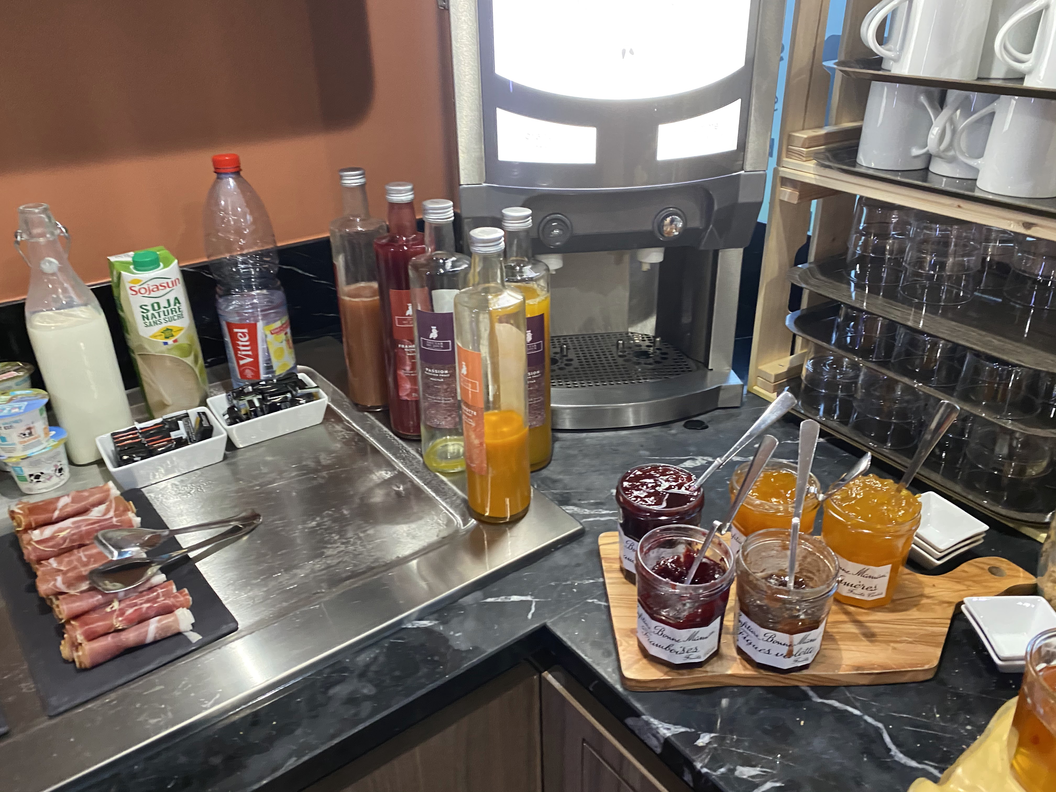Pas assez d'espace pour le buffet petit-déjeuner. Et le choix et limite pour le prix demandé. Vous pouvez ajouter 1 compote et plus de produits laitiers et plus de choix pour kes fruits frais